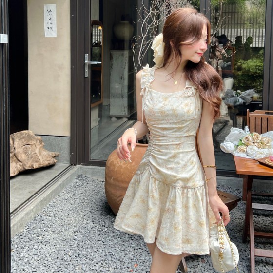 法式气质吊带新款碎花连衣裙女夏季收腰小个子显瘦吊带裙短裙裙子