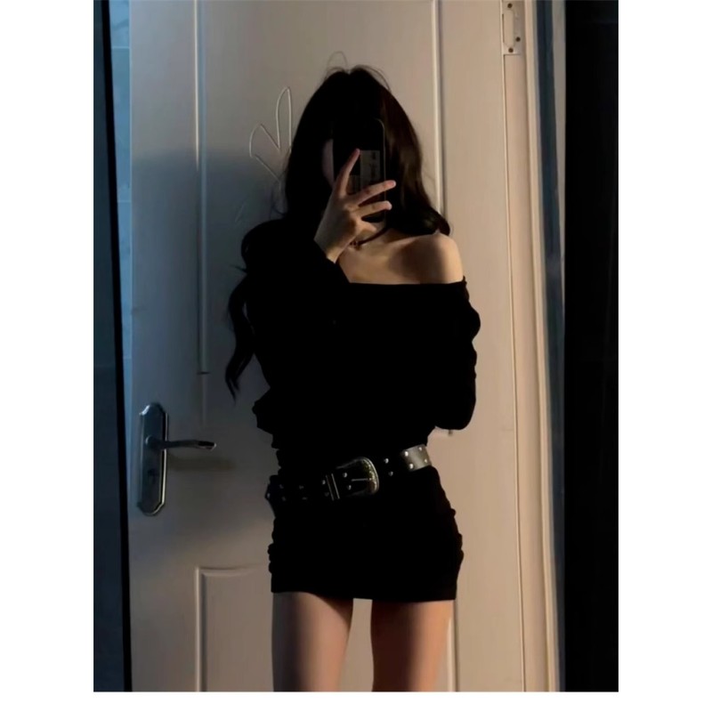 钓系约会一字肩黑色织连衣裙女秋冬新款性感辣妹御姐风包臀短裙