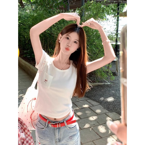 92棉8氨纶 慵懒百搭刺绣口袋圆领短袖T恤女修身显瘦内搭小上衣潮